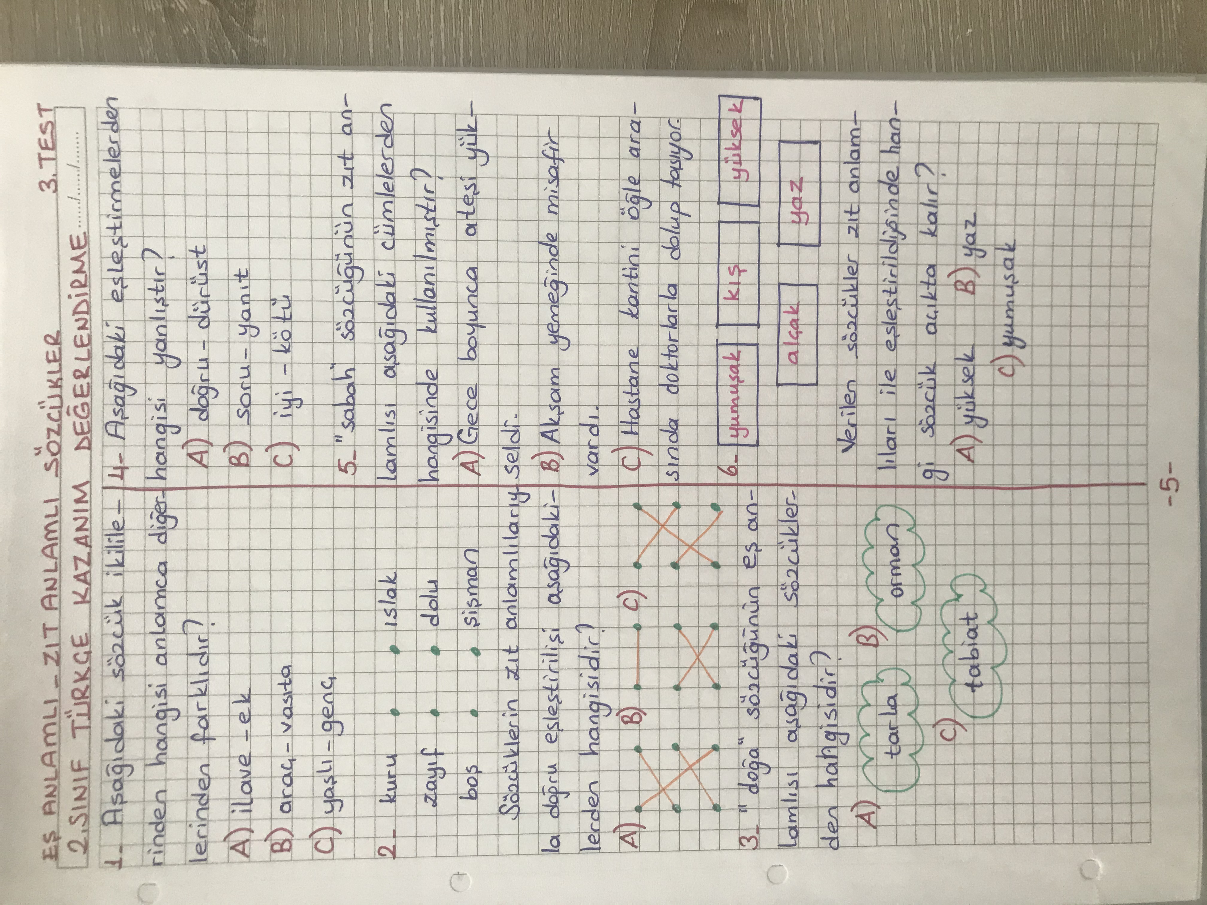 2.Sınıf Türkçe Eş ve Zıt Anlamlı Sözcükler İle Cümle Bilgisi Test