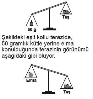A) Elma ile taşın kütlesi eşittir. B) Taşın kütlesi 50 gramdan büyüktür. C) Elmanın kütlesi 50 gramdan küçüktür. D) Elmanın kütlesi, taşın kütlesinden büyüktür.