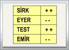Dört farklı harften oluşan bir sözcüğü bulmak için tablodaki tahminler yapılmıştır. Tahminlerin yanındaki her "+" işareti, doğru yerde bulunan bir harfe, her "-" işareti ise yanlış yerde bulunan bir harfe karşılık gelmektedir. Bu bilgileri kullanarak sözcüğü bulunuz.