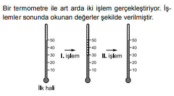 A) I. işlem sonunda taneciklerin hareket hızı artmıştır. B) Termometre önce ısı almış, sonra ısı vermiştir. C) Termometredeki sıvı önce büzülmüş, sonra genleşmiştir. D) Termometredeki sıvı önce büzülmüş, sonra genleşmiştir.