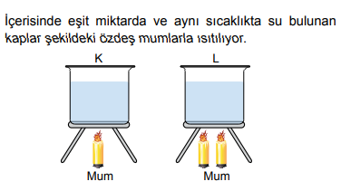 A) K ve L kapları eşit süre ısıtılmalıdır B) L kabı K kabından iki kat daha uzun süre ısıtılmalıdır. C) K kabı L kabından iki kat daha uzun süre ısıtılmalıdır. D) L kabı K kabından dört kat daha uzun süre ısıtılmalıdır.