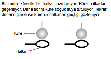 A) Isı alan halka genleşmiştir B) Isı veren metal küre büzülmüştür C) Soğuk sudan sıcak küreye ısı akışı olmuştur. D) Başlangıçta halkanın çapı kürenin çapından büyüktür