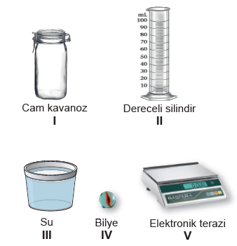 | Kaan, bir bilyenin hacmini ölçmek için bazı malzemeler kullanıyor | 623) Buna göre Kaan’ın deneyini gerçekleştirmesi için kaç numaralı malzemeleri kullanması yeterlidir?