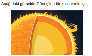 | Bu görselle ilgili, I. Güneş’in de tıpkı Dünya gibi katmanlardan oluştuğunu göstermektedir. II. Görseldeki katmanların farklı renkte olması sıcaklıklarının da farklı olacağı anlamına gelebilir. III. Yüzeyde görülen gaz fışkırmaları, yüzey sıcaklığının Güneş’in merkezindeki sıcaklıktan daha fazla olduğunu kanıtlar. | 95) ifadelerinden hangileri doğrudur?